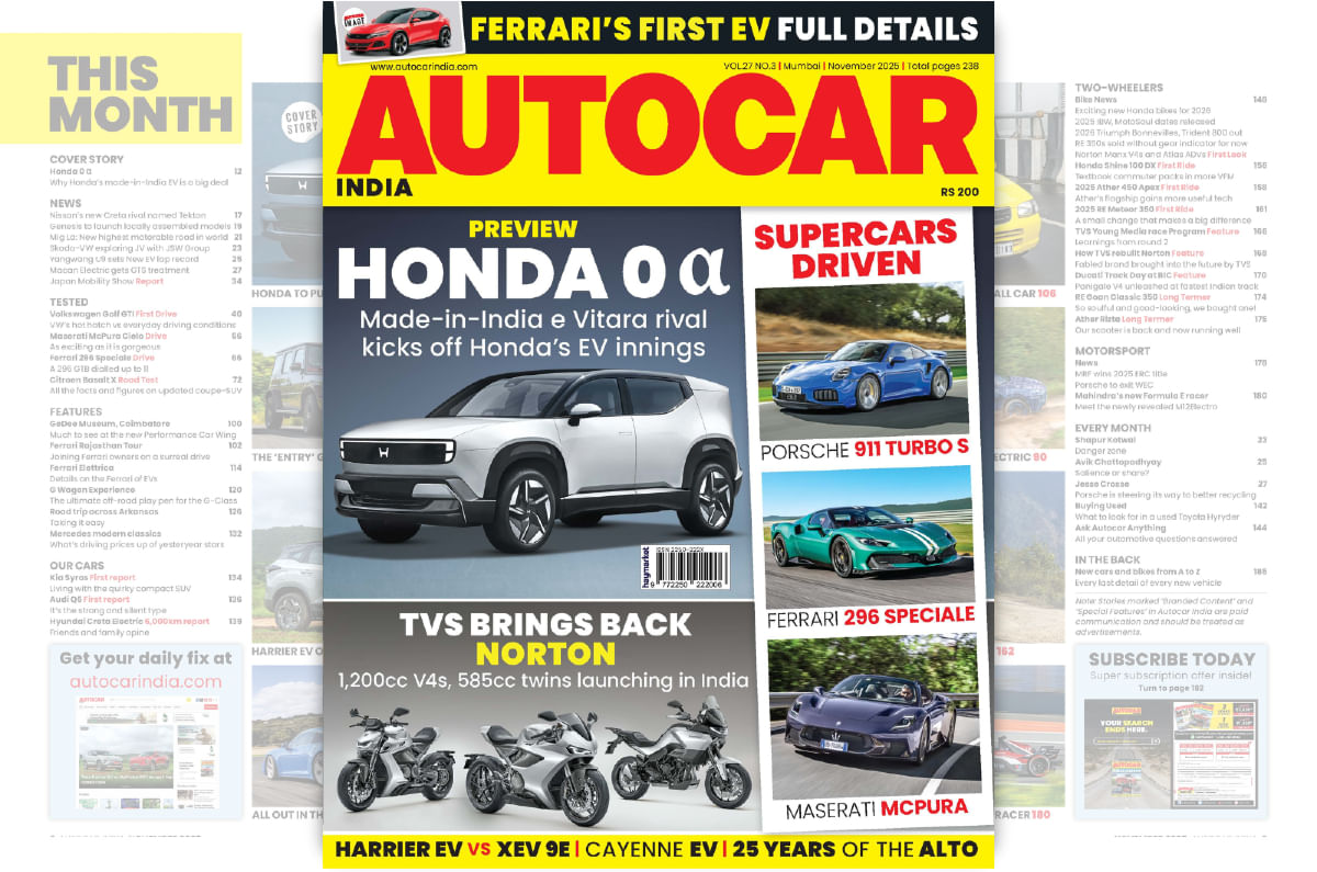 The November 2025 issue of Autocar India is headlined by the Honda 0 Alpha concept. We whet our appetite for adrenaline with drives of three supercars – the Porsche 911 Turbo S, the Maserati MCPura and the Ferrari 296 Speciale. We also have reviews of the Volkswagen Golf GTI hot hatch, the new Mercedes-Benz G 450d, and we take an in-depth look at the Porsche Cayenne Electric. In the bike section, we have news on Norton’s new bikes and a review of the TVS RTX 300. This and more in this issue of Autocar India.