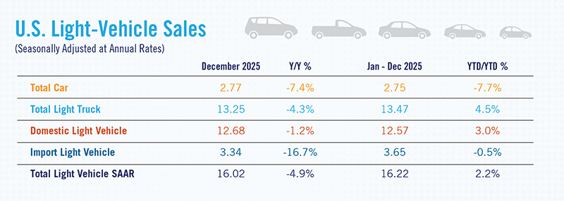 New Light-Vehicle Sales Rose 2.4% to 16.2 Million Units in 2025 – CollisionWeek